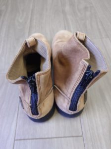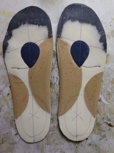 つなぎ目は段差にならないよう漉き、剥がれないよう縫い目をいれておきました。また底が硬い靴の為、白いクッションを足し、きつくなるつま先と母指球・小指球は削り落としました。