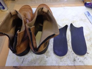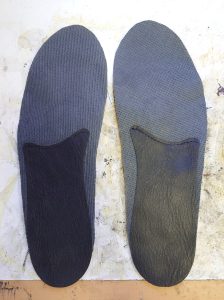 仕上がり後お渡しの際に試し履きしていただき、シューケアも含めてご満足していただけました。しかしお話を伺っていると、アーチサポートの付いたインソールを使いたいけど靴の中のスペースが無くて入れられない…とのこと。部分的なパットなら100均で売ってますが、柔らかすぎてサポートにならず効果が薄い上にすぐ剥がれてしまいます。