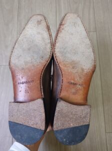 他の靴修理屋さんと比べ、当店ではなるべく前足部の靴が曲がる位置から距離を取ってつなぎ目を作っています。削れが激しい場合は更に踵よりにして底をカバーしたい時もありますが、ロゴマークが消えてしまうのでその場合は相談させていただきます。