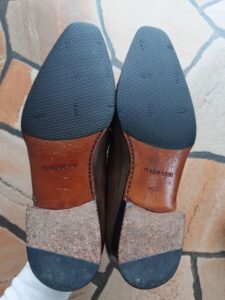 ただ、ゴムの方が革底にダメージが通りにくく、滑りずらく、クッションにもなります。特に底に縫い目が出ている靴は出来るだけ早くゴムを貼らないと縫い糸が切れてソールが剥がれやすくなってしまいます。メリットが多いためハーフソール修理はお勧めしたいところですが…やっぱり好みがありますので。