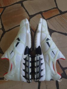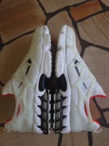 そこで、とにかく水分を減らした状態にしてから干してみました。革靴ならともかく、運動靴やスニーカーは履き口などにスポンジが内蔵されており、それが乾くのが遅れる原因になります。しかし乾燥機やドライヤー、直射日光などに当ててしまうと変形や素材の劣化、剥がれにつながりますので形崩れしないよう両手で挟みながら水分を絞り、乾いた要らないタオルを押し当て更に水気を取り、新聞紙をしっかり詰めて陰干しさせます。天気をチェックし、なるべく湿気の少ない日に丸洗いすることも重要です。