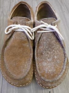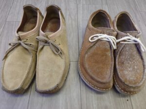 こちらも何度もご利用頂いているお客様より、カビ除去のご依頼です。ワラビー(ベージュの方)は一見そこまでカビが生えていないように見えますが、ソールと内部に生えていました。カビ跡を完全に消せるかどうかはやってみないと分からない部分がありますが、今回はそれなりに綺麗になってます。
