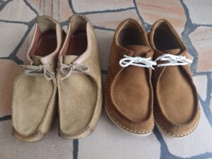 ②クラークスのワラビー、ビルケンシュトックのモカシンシューズ