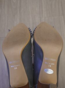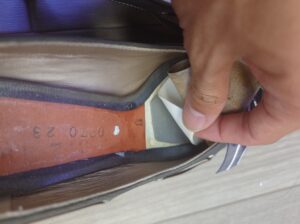 そこで前足部のスペースを狭めることで足の前滑りを防ぎ、踵の緩みを解消する…このようなパンプスで良く使われる調整方法です。しかし、実は購入したお店で既に中敷きの下にスポンジを足す調整をしてもらったとのことで、これ以上厚みを足すと小趾が当たってしまいます。なのに踵は緩いまま。