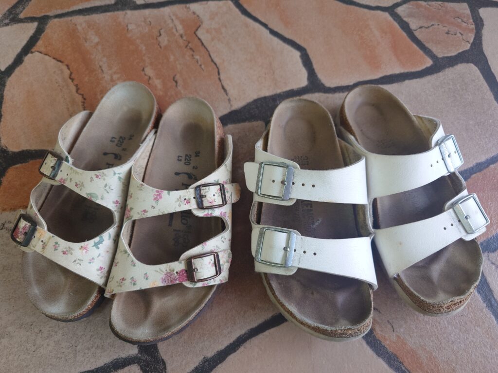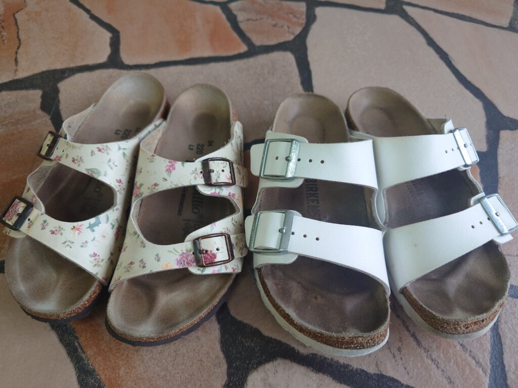 ビルケンシュトックのアッパーは同じような見た目でも革だったり合成皮革だったりしますが、今回は2足ともBirko-Florという人工皮革。