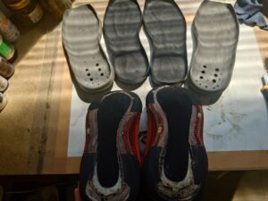 お預かりした状態ではアウトソールのグリップは効いていましたが、今後アウトソールの経年劣化でひび割れやグリップ力低下のリスクがあることをご了承いただき、それでも修理してほしいとのことでしたのでアウトソール~ミッドソールまで剥がして接着させていただきました。