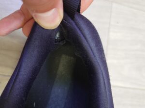踵のライニングに穴が開き、ヒールカウンターが折れ曲がって足に刺さるようになってしまったとのこと。