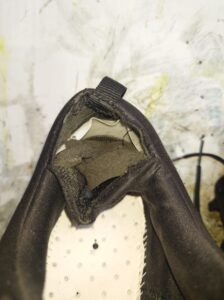 本題の修理ですが、折れ曲がってしまったヒールカウンターは完全に元通りにすることは出来ませんので、お客様にご了承頂いた後、熱を加えて出来る限り伸ばし、伸ばしきれない部分は切除しました。(3㎜くらい)