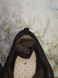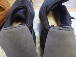 そのまま貼り付けると必ずシワが出来てしまう為、真ん中に切り込みを入れました。が、ぱっと見ても分からないと思います。ヒールカウンターも3㎜しか切除していないので、履き心地もあまり変えずに仕上げられました。