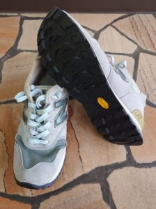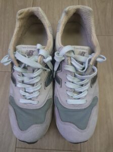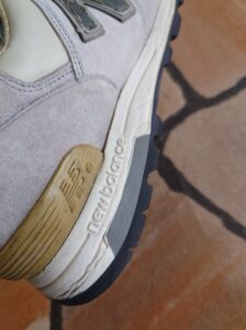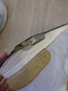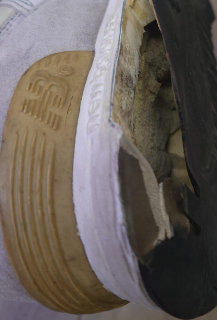 ミッドソールの内部(ポリウレタン)素材が劣化してスカスカになり、アウトソールのゴムもすり減ってしまっています。