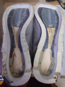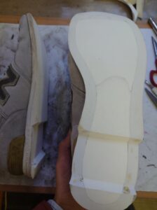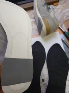 接着後、余分な部分を削り、更に「小窓」と呼ばれる踵の窪みにグレーのEVAを接着。