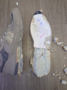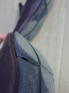 こちらも経年劣化によりソールが割れています。ちょっと特殊な構造で、靴の中までソールが埋め込まれている為、EVA素材で埋めてから作成したソールを接着しました。